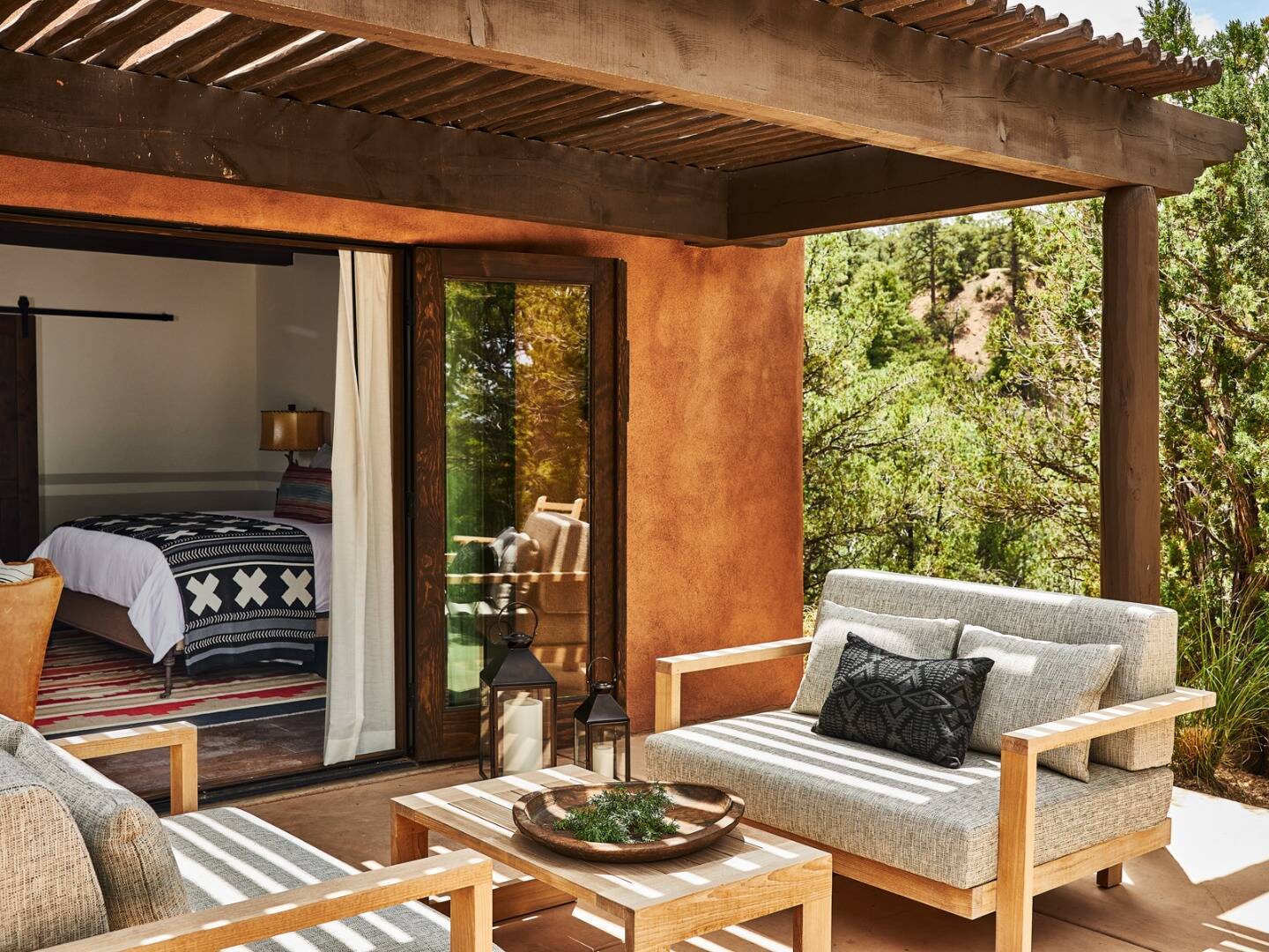 Accommodations number 100 in total and are divided among guest rooms, suites, casitas and one enormous 12-bedroom Bunkhouse. All are decorated in a style that feels quintessentially Santa Fe: think kiva fireplaces adorned with antlered skulls, rustic exposed beams (crafted from reclaimed wood rescued from old farms) and plenty of woven accents throughout, alongside art pieces created by both local and Native American artists. Minimalist four-poster beds and chic furnishings add an air of contemporary luxury, while bathrooms feature beautiful details like mosaic tiling and deep copper soaking tubs. Upgrade to a suite or casita for more legroom, elevated design, and – in some cases – private pools. Or opt for an unforgettable family getaway in the enormous bunkhouse, which features a magnificent great room with soaring ceilings and a two-story fireplace.