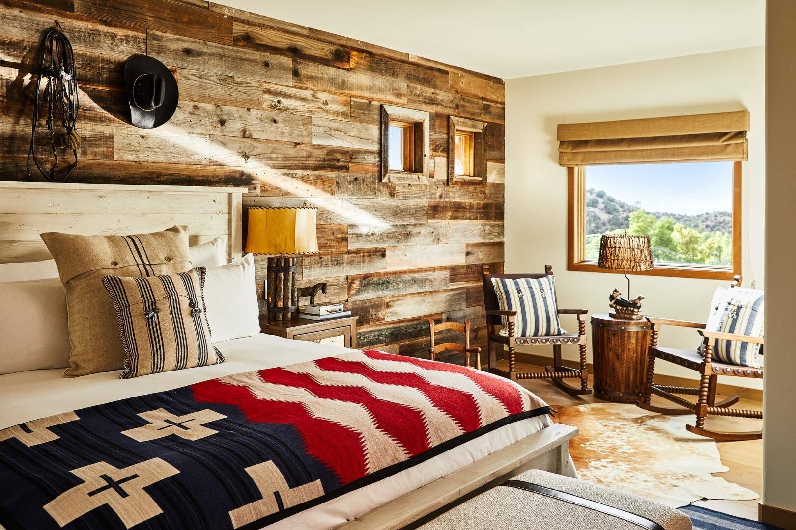 The Bunkhouse King rooms are situated on both the first and second floors of the building. The guestroom features warm and inviting furnishings, accented by Navajo patterned textiles and western artifacts, and includes a king bed, ensuite tiled bathroom and private outdoor terrace with rocking chairs. A barn door slides open to reveal a further small room with bunk beds, making it ideal for families with young children.