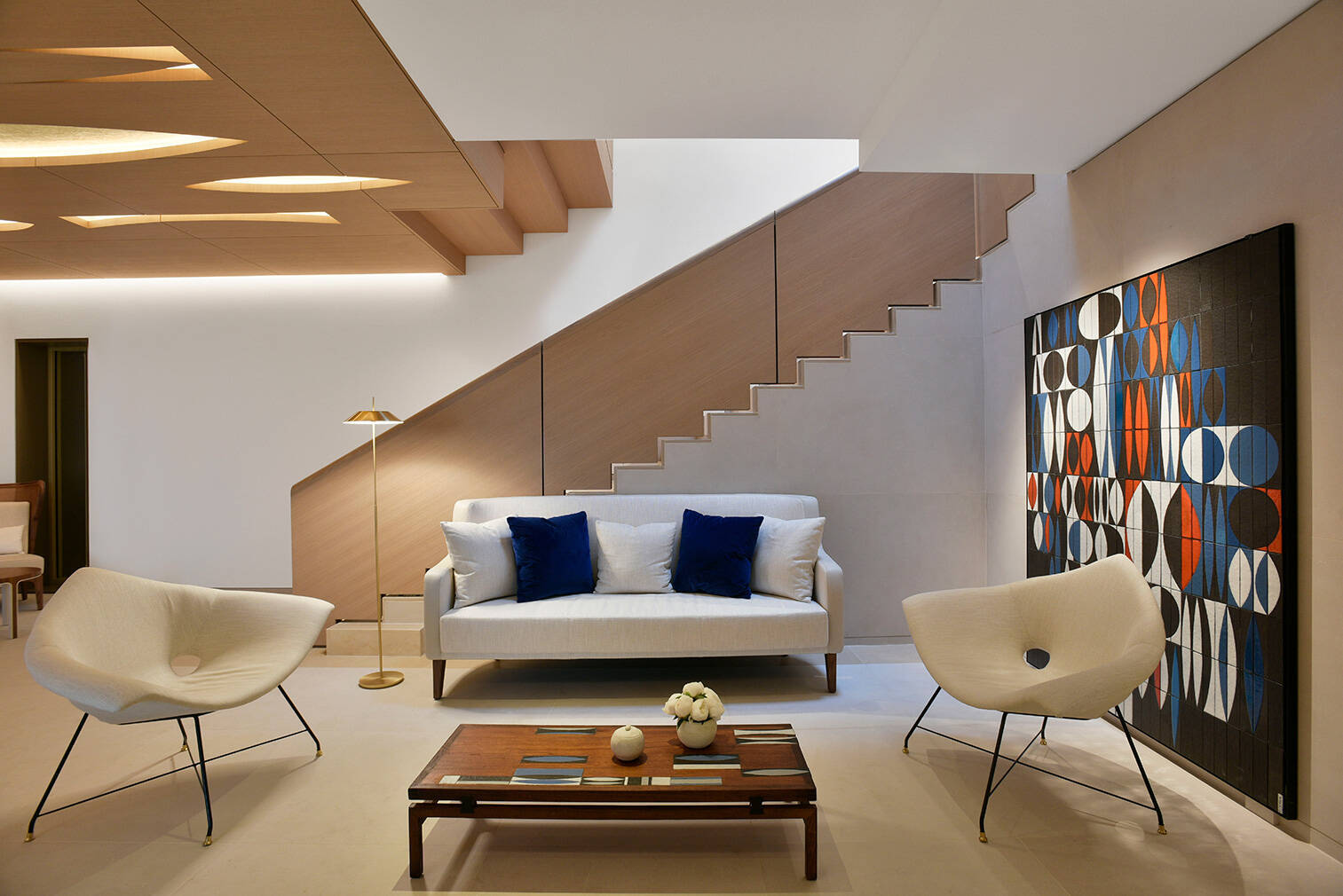 Conceived by Jean-Michel Wilmotte, the 55 sqm (605 sqft) Duplex Sea Suite unfolds elegance over two floors with an enveloping palette of blue and cream.