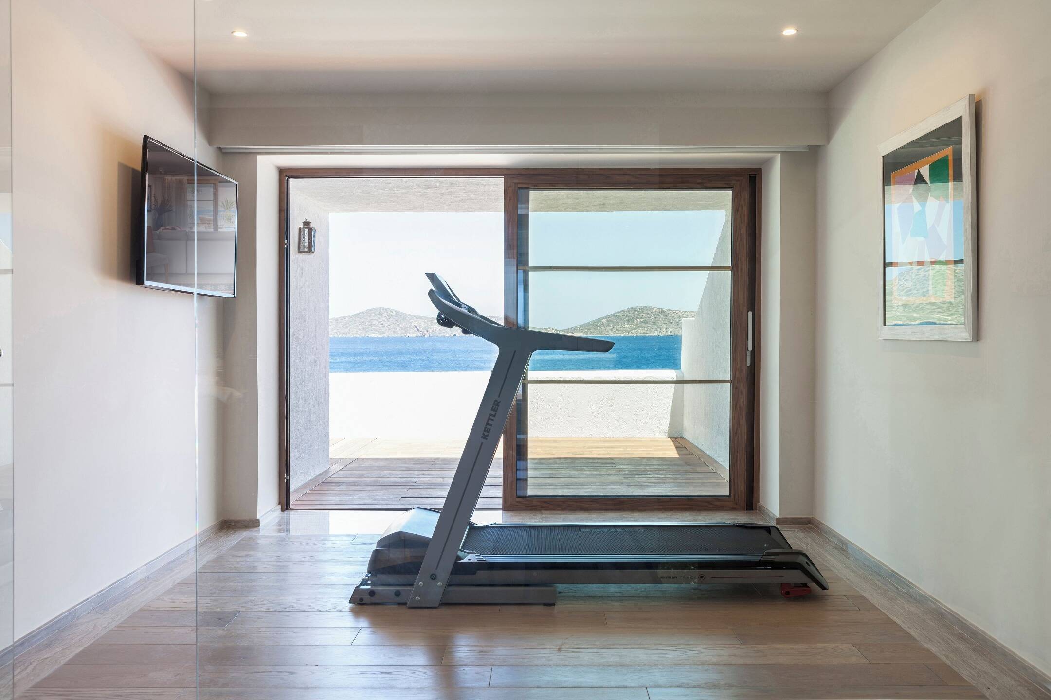 Balcony with sea view – A fitness room with great view over the beach and the blue Aegean Sea