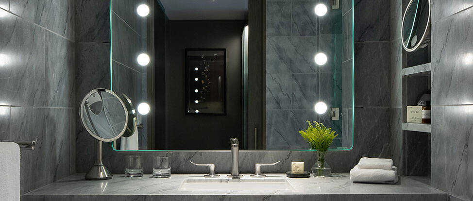 Overlooking the LA skyline, our largest corner suites are equipped with 3 private furnished balconies, separate living room with sofabed, dining table and chairs, guest bathroom. The main bedroom features a spacious bathroom with dual-sink vanities.