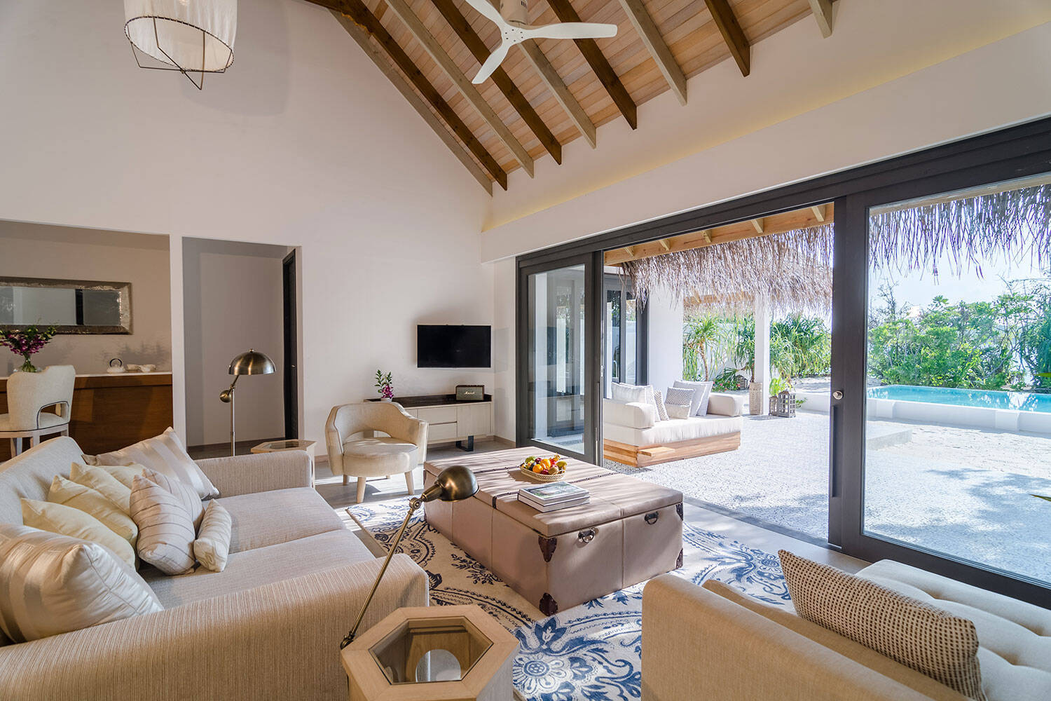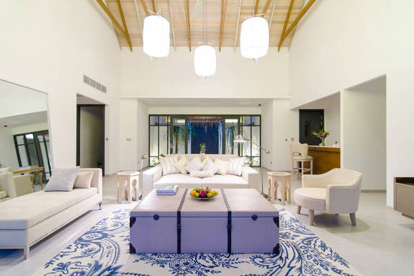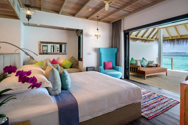 Bohemian inspired overwater lagoon villas feature direct access to the ocean, unique furniture design including crystal chandeliers, retro cain seating, marshall speakers, 40-inch flat screen TVs, private wine mini bar, large outdoor sundeck and outdoor showers, separate bathroom with ocean view bathtub and indoor shower overlooking the breathtaking lagoon and 1.8km sandbank.