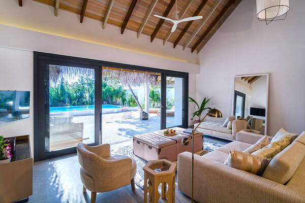 Have you ever dreamed of a villa on a white sandy beach? This one will make your dreams come true. Suitable for families or a group of friends. All the rooms are whitewashed and perfectly equipped in light, summery colours. There are two master bedrooms, separate bathrooms, a 10-metre pool and a view to die for of the sunset side of Finolhu. You can relax with a drink on your own private beach. The opportunities are endless here; from open-air dinners to a private party with butler service.