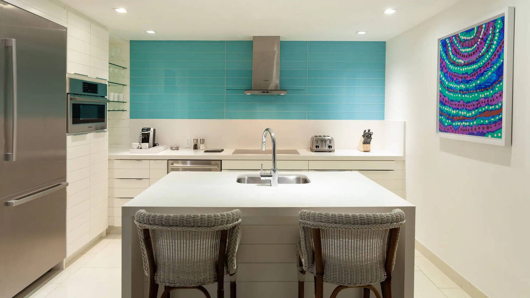 Tropical island ambiance welcomes visitors to this grand 2500 square-foot residence, located in the West Tower, that includes a master and two additional bedrooms, all with one king-sized Hyatt Grand Bed, full kitchen, separate sitting area, 3.5 bathrooms, washer & dryer with stunning views of turquoise ocean waters.