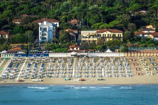The 28 elegant guest rooms and suites are each individually decorated in contemporary Mediterranean style with dark hardwood floors and marble accents. Every room offers picturesque views of the sea or the Apuan Alps, and some room categories come with a private terrace with sea views. Boasting a perfect layout for a relaxing beach vacation with family or friends, the bi-level Family Suite has one bedroom on each level, offering extra privacy while still making it easy to spend time together in the spacious living room and private patio. The expansive Presidential Suite features a spacious terrace where you can take in Mediterranean Sea views, cool off in your private outdoor pool, or stretch out on a lounge chair to enjoy the sunshine. This one-bedroom suite also features a stylish living room and both indoor and outdoor dining areas.