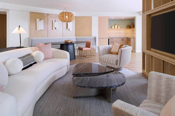 Experience 1,435 square feet of island living with our elevated luxury suite offering a complete living area with refined furnishings, a wet bar, one full bathroom, a king bedroom, a primary bathroom with premium finishes, an exquisite soaking tub and a selection of Na Ho'ola Spa products. Step into one of your three private lanais for breathtaking ocean and city views.