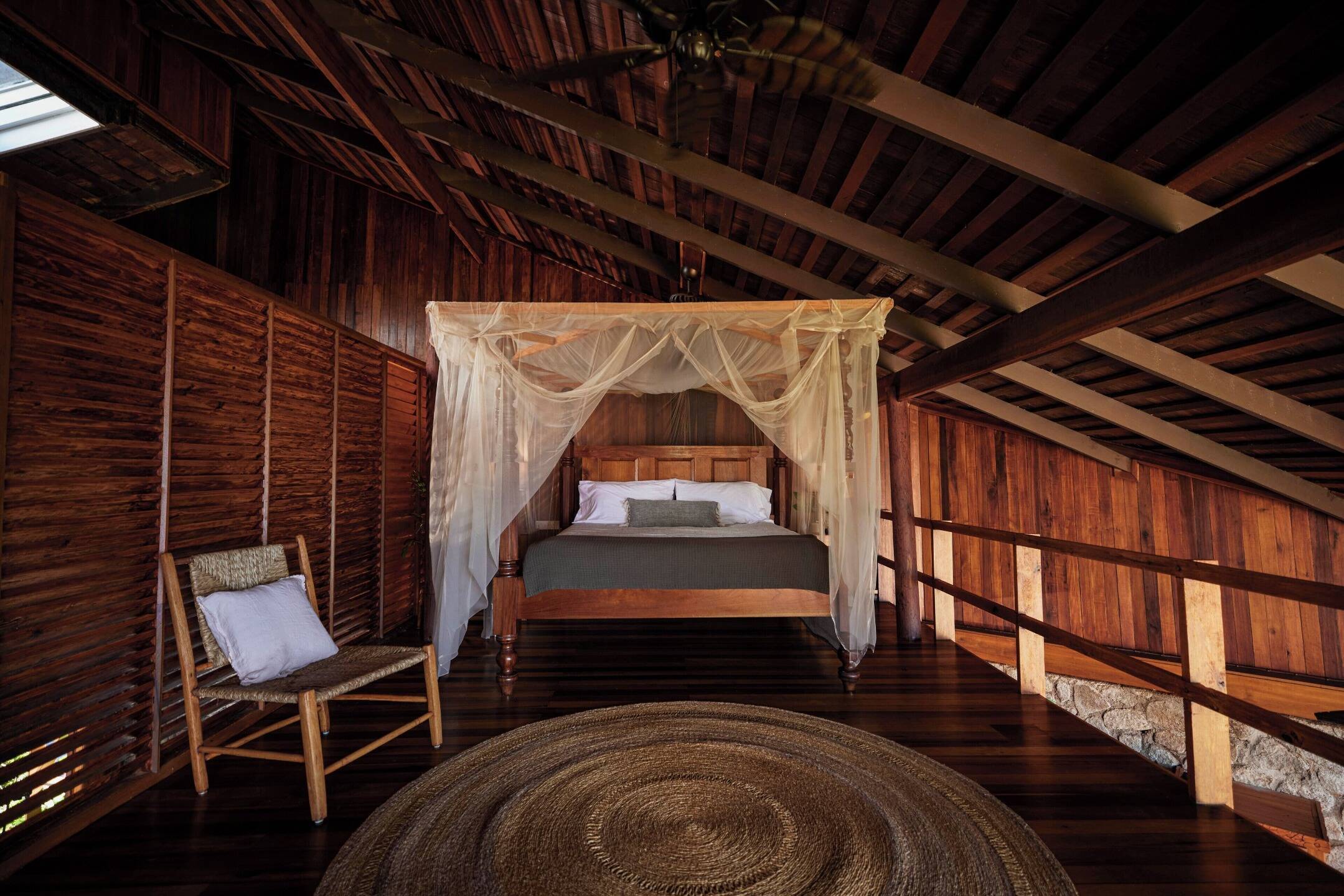 In beautiful wooden suites, four-poster beds are draped with fine netting. And a good thing they are, as the rooms lack a fourth wall and are entirely open to the unforgettable view (and the unforgettable view’s accompanying geckos and hummingbirds). Each piece of exquisitely carved furniture is handmade on-site by St. Lucian artisans from a variety of tropical hardwoods.
