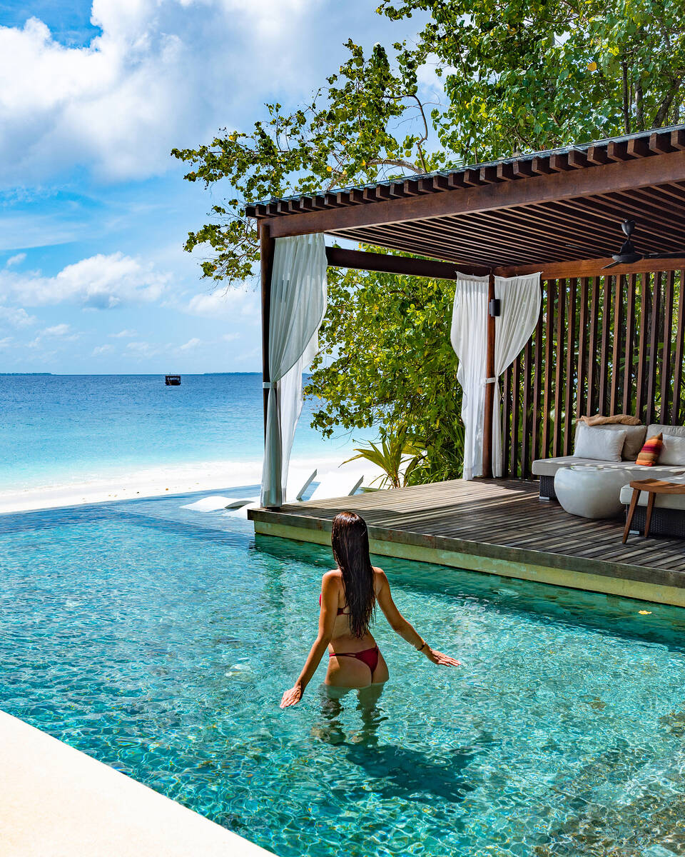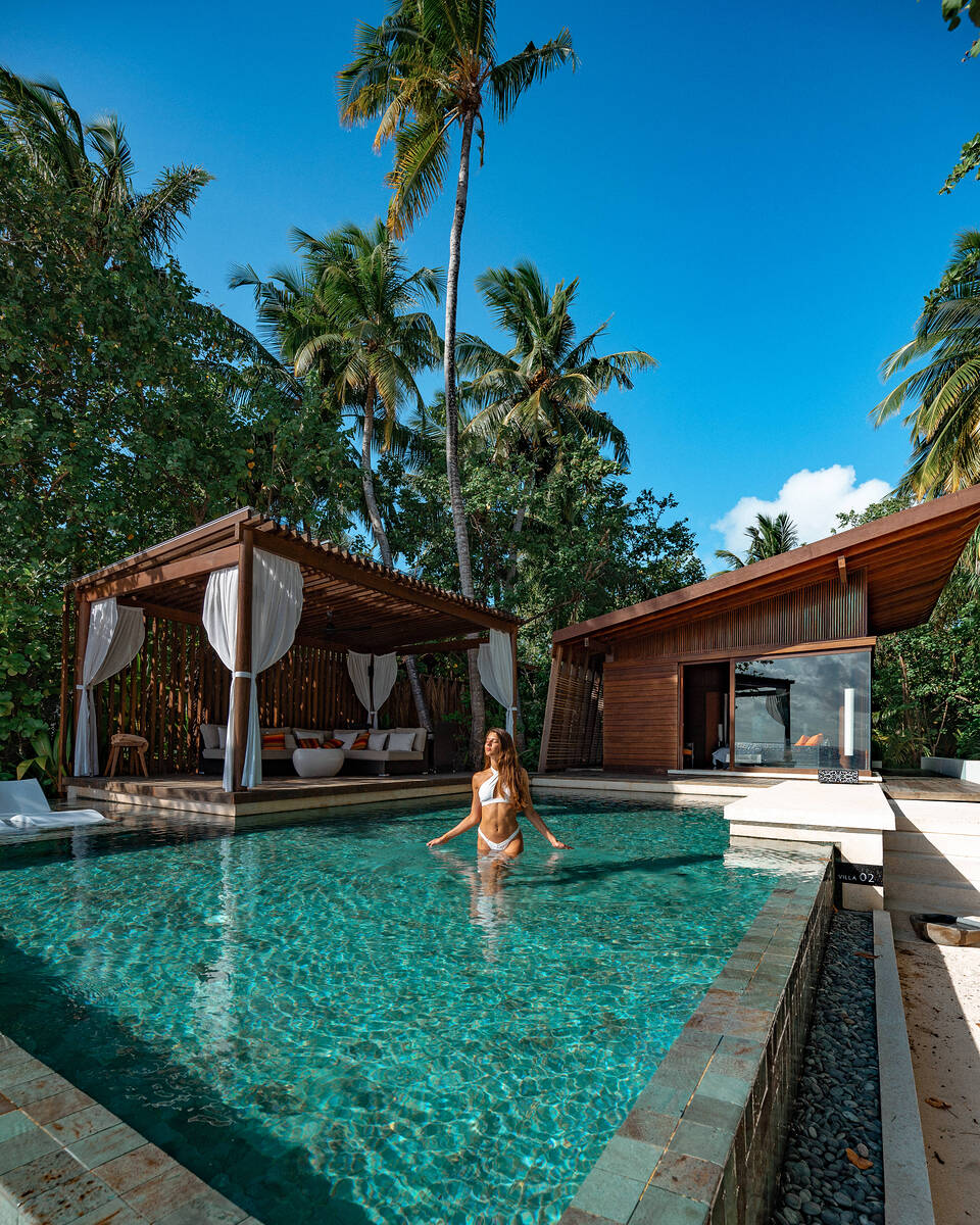 The villas are fitted with a king bed, chaise lounge overlooking a private plunge pool and deck, indoor and outdoor shower area with terrazzo bathtub and rain shower area with direct beach access.