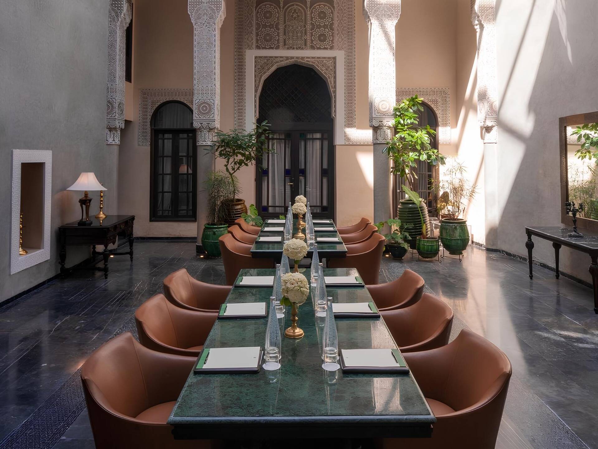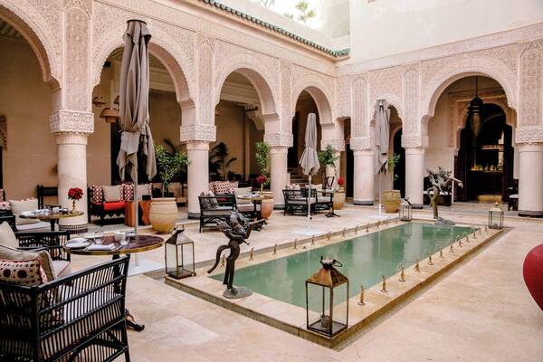 Within, the riad is majestic to behold, with Moorish design represented in all its glory. Artisanal details (some new, some old) like carved doors, ceramics, stuccos, zelliges and exquisite embellishments abound. The 15 rooms and 15 suites that comprise the riad combine elements of both contemporary and traditional design to create bespoke spaces with a unique sense of place. Simple, unadorned walls blend with intricate ornamentation to create settings that are both eye-catching and serene. Each accommodation has been arranged and decorated in accordance with the historical nature of the... Show more