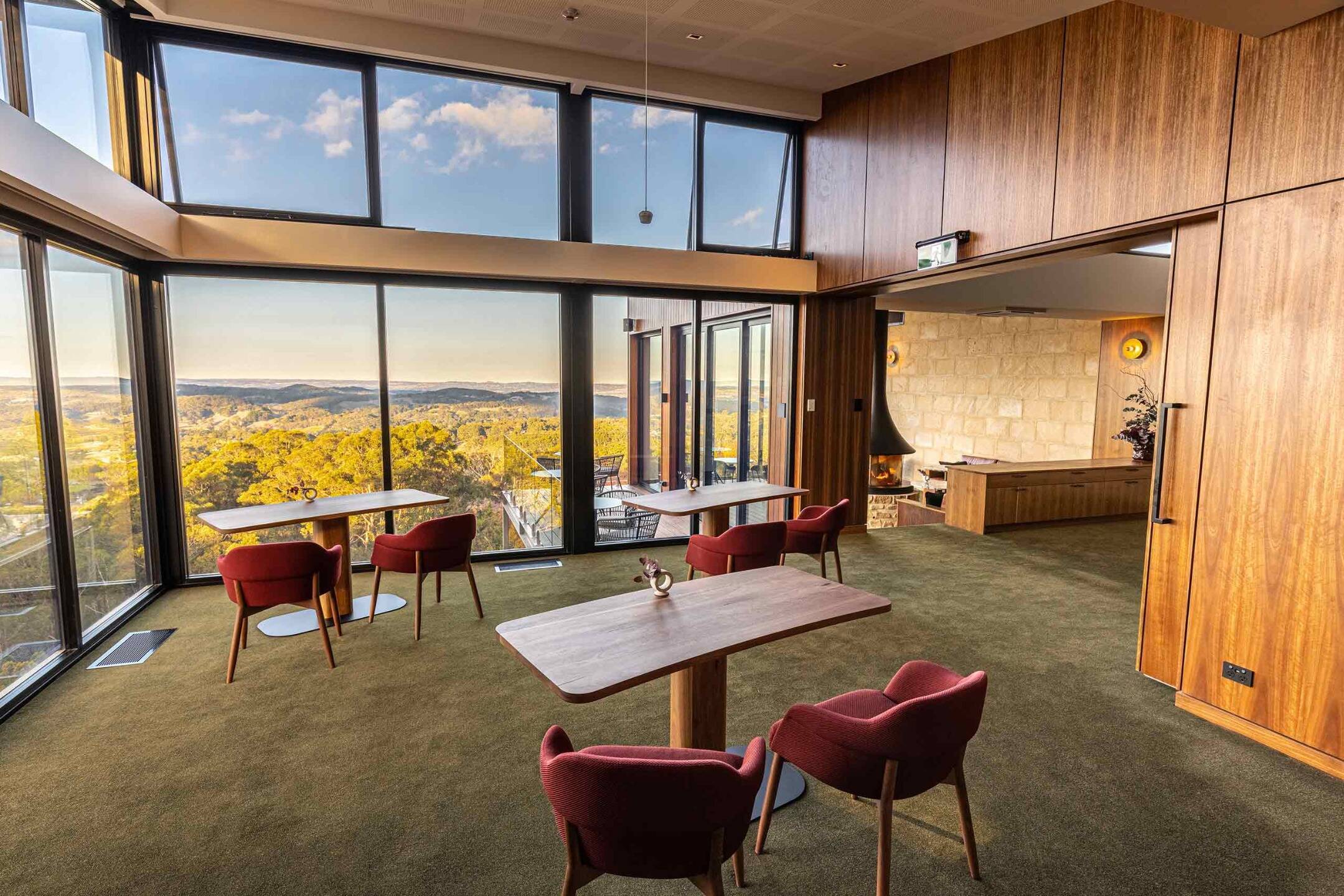Fourteen suites in all comprise the lodge, and guests must be at least 18 years of age to stay. Suites enjoy ultra-scenic locations on the edge of Piccadilly Valley, complemented by open-plan layouts and large windows that frame panoramic views. Interiors feature an abundance of natural materials supplemented by the handiwork of local craftsmen and artisans, creating tranquil oases with a distinct sense of place. Notably, each suite also features an original oil painting by Stephen Trebilcock, the lodge's resident artist. Underfloor heating, daybeds on the balcony and sunken lounge rooms warmed by gas fireplaces encourage guests to cosy up, converse and unwind.