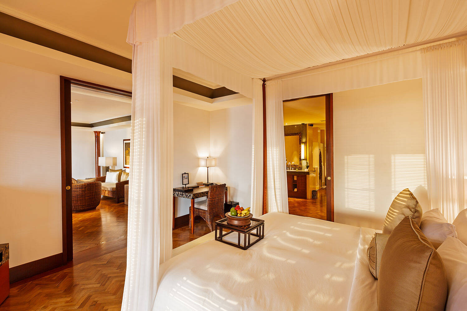 The One-Bedroom Superior Suite comprises of a large bedroom with a canopy bed. A separate dining and living area open onto a private balcony with a daybed facing to the ocean and allows for private dining. The bathroom includes a large bathtub, separate shower, double vanities and dressing area. 105 square metres including balcony.