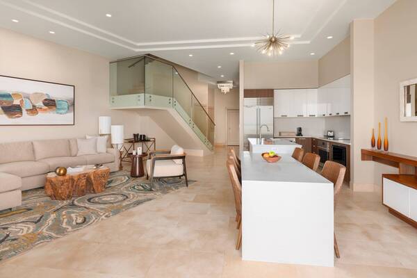"Make yourself at home in these elegant residential-style suites, which come with signature butler service, stunning turquoise ocean views and modern kitchens."