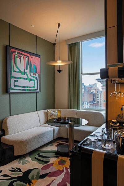 Guest rooms here are colourful but sophisticated, decked out in bold hues like dark green, plum and touches of tangerine, all enhanced by mirrors that reflect the natural light streaming in through large windows. Some rooms are available with an additional sofa bed or park views, while Deluxe Suites offer a partially separated living area to enjoy. Two choice options are the Premier Suite and the Urban Suite, which are both set on a corner of the hotel for enhanced views. Each room includes little touches inspired by the city, including custom-commissioned artwork, lighting fixtures inspired by subway stations and taxicab-inspired faucet handles.